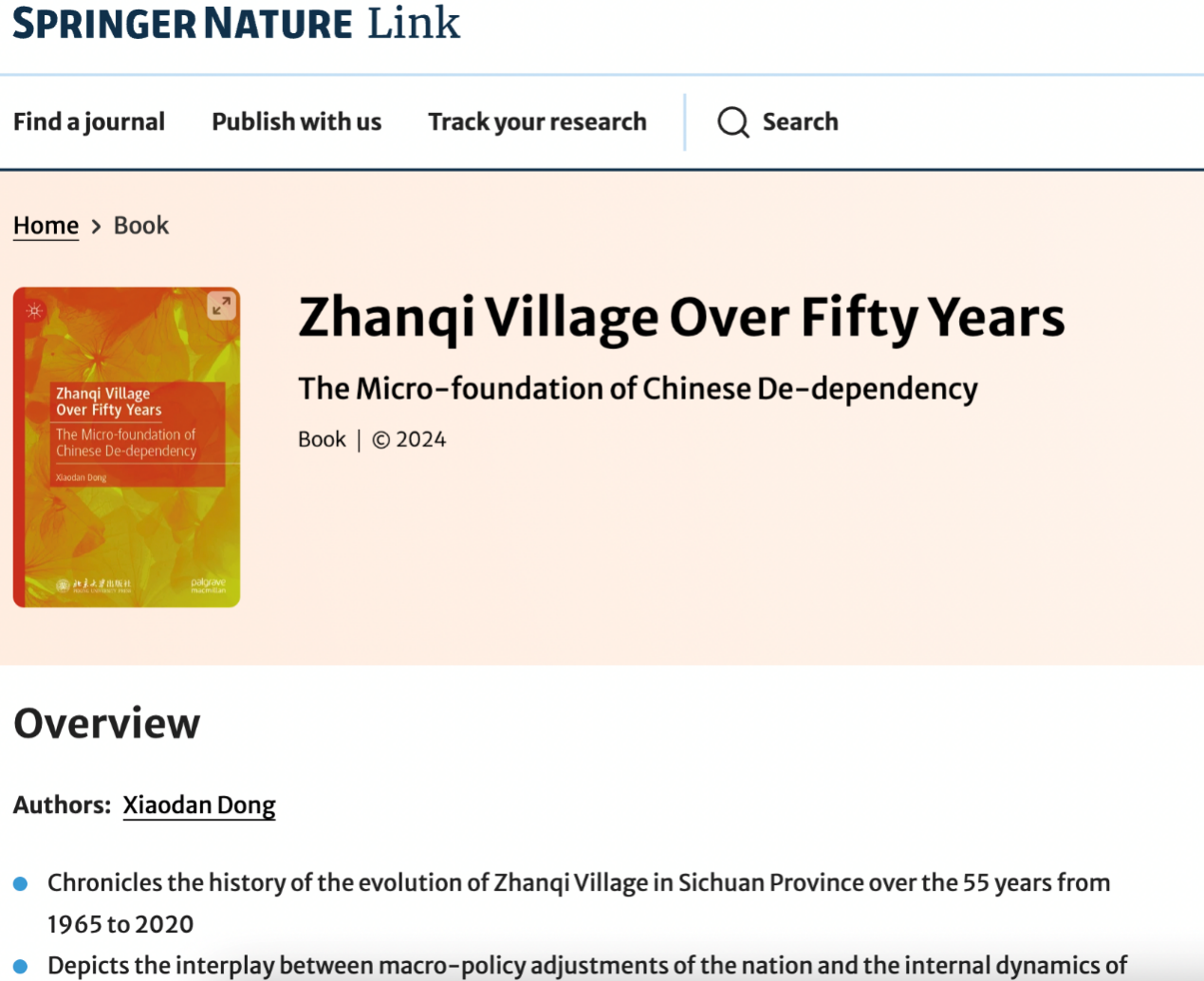 六合宝典app下载 董筱丹副教授的学术著作《Zhanqi Village Over Fifty Years: The Micro-Foundation of Chinese De-dependency》近日由施普林格·自然(Springer Nature)出版集团旗下的帕尔格雷夫·麦克米伦(Palgrave Macmillan)正式出版发行。
