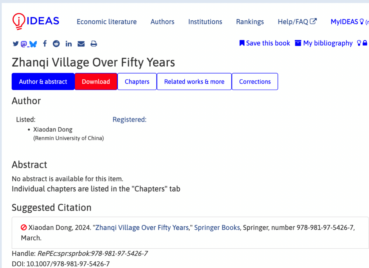 目前,《Zhanqi Village Over Fifty Years》已通过亚马逊、施普林格等平台面向全球读者发售,电子书与纸质版同步上线,并已被澳大利亚国家图书馆及最大的经济学专用书目数据库IDEAS等平台收录。