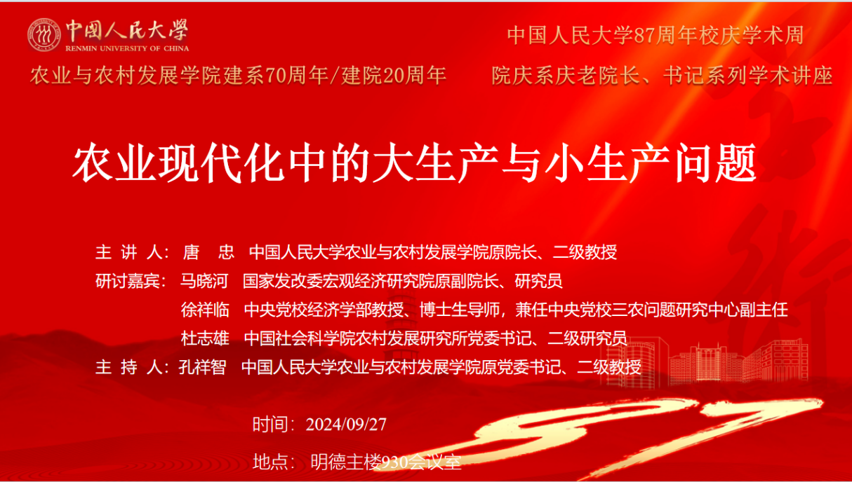 2024年9月27日下午,六合宝典app 建系70周年/建院20周年院庆系庆老院长、老书记系列学术讲座第一讲——“农业现代化中的大生产与小生产问题”在明德主楼930会议室成功举办。本次讲座是学校87周年校庆学术周的系列活动之一。