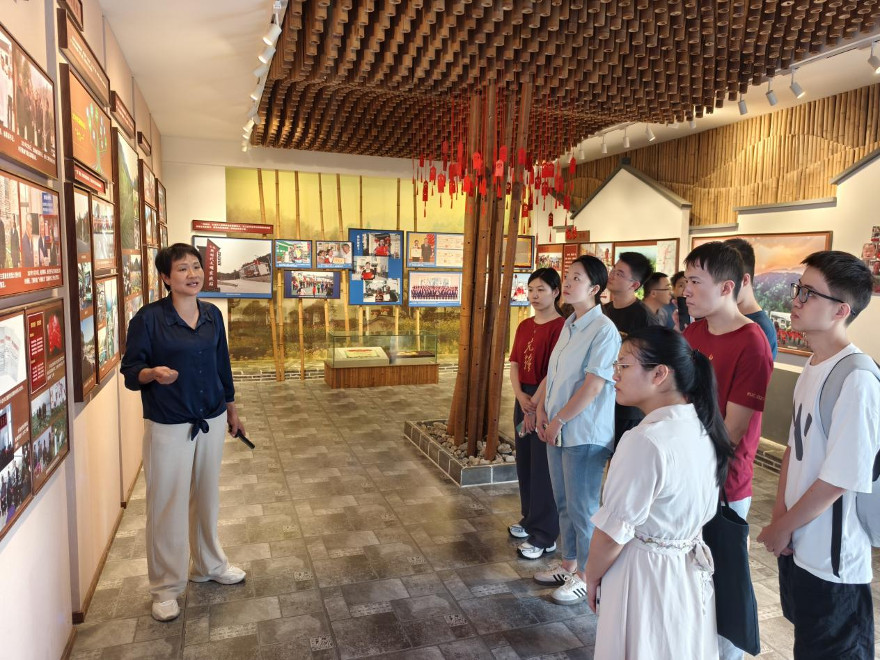 8月19日上午,调研团深入探访了大别山腹地的红色小镇——金寨县汤家汇镇。作为革命精神的熔炉与革命骨干的摇篮,汤家汇镇见证了中国共产党在皖西地区首个党组织——笔架山农校的诞生,素有“一座完整的苏维埃城”的美誉。调研团依次踏访少共豫东南道委 少共赤南县委旧址、豫东南道区苏维埃政府旧址、皖西北特区苏维埃银行、原赤城县邮政局等地,在讲解员的生动讲述下,调研团成员仿佛穿越时空,亲身体会了那段烽火连天的革命岁月,深刻感受到先辈们不屈不挠的斗争精神与开创伟业的壮丽篇章。调研第二站,调研团师生来到十万剧场,戴上VR头盔,感受当代科技与红色故事的巧妙结合。