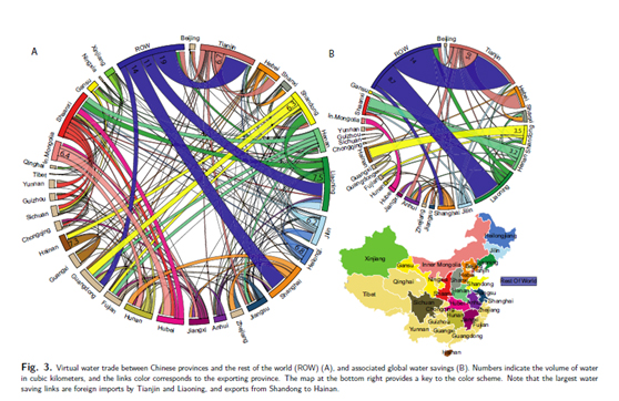 随着中国经济的快速增长,水资源短缺日益明显,并对农业生产形成制约。中国耕地资源和水资源在空间上严重不匹配,北方作为粮食主产区地多水少,而南方水多地少。受该因素的影响,中国的水资源以农产品贸易的形式从地多水少的北方地区运输到水资源丰富的南方地区,这一流动在一定程度上加剧了中国农业用水资源紧缺程度。该研究利用中国农业可持续发展决策支持系统(CHINAGRO)和线性优化模型对2005年中国省际间主要粮食作物和主要畜产品的贸易进行了模拟,并将该模拟结果与水文学模型(H08)计算的主要农产品在不同地区生产的耗水量结合起来,构建了中国省际间和国际农产品贸易的虚拟水贸易网络。研究表明中国各省的农业用水效率存在巨大的差异。研究发现中国的农产品虚拟水贸易中,有80%来源于国内的省际间贸易,20%来源于中国的国际农产品贸易,其中大豆进口占了中国国际贸易虚拟水流动的93%。从国内的农产品虚拟水贸易来看,省际间农产品贸易有利于提高绿水(主要指降雨)利用效率,但降低了蓝水(灌溉水)使用效率。这也意味着中国国内的农产品贸易趋向于从水资源稀缺的地区流向水资源丰富的地区。研究也指出了提高灌溉用水效率潜力较大的省份(如内蒙古)和产品(如玉米)。