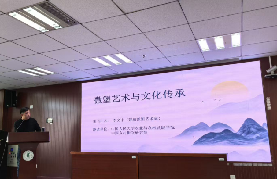 中国人民大学社会发展工程创新中心(乡村振兴)执行主任、学院农业经济系主任黄波担任对话嘉宾。他认为,李义中老师 以微塑为媒,以“文艺赋美乡村”为题建设探索出一条兼具审美表达与产业潜力的有效路径,并围绕“大众如何参与微塑创作”、“如何在传播乡愁中形成更具穿透力的作品”等问题与主讲人展开交流。