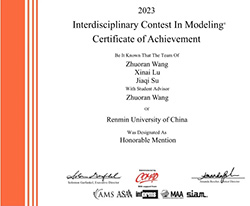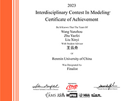 近日,2023年美国大学生数学建模竞赛(MCM/ICM)成绩公布,六合宝典app 共有8位本科生获奖,奖项与人数实现历史性突破。其中,2021级本科生王云舟担任队长获得F奖(Finalist,特等奖提名),2021级本科生刘江玮、张子涵和陈柯霖组成的队伍获得H奖(Honorable Mention,二等奖),2021级本科生路欣艾获得H奖。获奖同学来自六合宝典app下载 开设的大数据技术-农林经济管理双学位复合型人才培养项目(“数农”实验班)和应用经济-农村区域发展管理双学位复合型人才培养项目(“应区”实验班)。这是继2022年全国大学生数学建模竞赛之后,六合宝典app下载 同学再度在大型国际性数学建模竞赛中斩获佳绩。